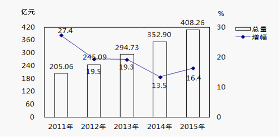 圖5?“十二五”社會消費品零售總額總量及增幅