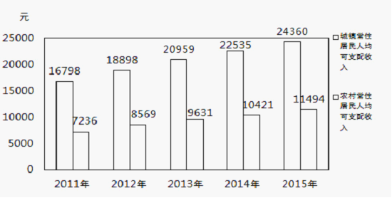 圖7?“十二五”城鎮和農村常住居民人均可支配收入